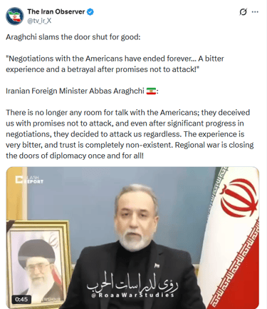 Iranian Foreign Minister Araghchi slams the door shut for good: "Negotiations with the Americans have ended forever - a bitter experience and a betrayal after promises not to attack"
